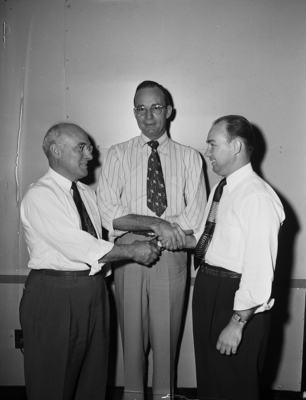 From left to right, W. F. Morgan, H. J. Emmins McCord, and Howard Crane shake hands on their new jobs