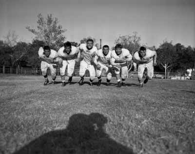 1,205 pounds of Paschal football talent. Left to right, tackles Scotty Williams, 190; Walter Gill, 200; Stepheson , 203; Douglas Hudson, 212; Claude White, 200; and Center Bill Collins, 200. Stephenson and Gill are lettermen. Published in Fort Worth Star-Telegram evening edition September 5, 1952.