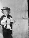 Rebecca Gracey, age 5, daughter of R. E. and Mary Gracey, and is the youngest of six sisters. Here she poses with a couple of 2-day-old Yorkshire pigs. Published in Fort Worth Star-Telegram morning edition May 7, 1950.