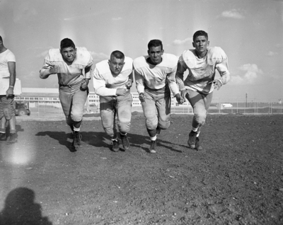 James Crumpton, John Walker, Ray Bender and Van Laird, left to right, are candidates for guard spots on Brewer High team at White Settlement. Published in Fort Worth Star-Telegram morning edition September 16, 1952