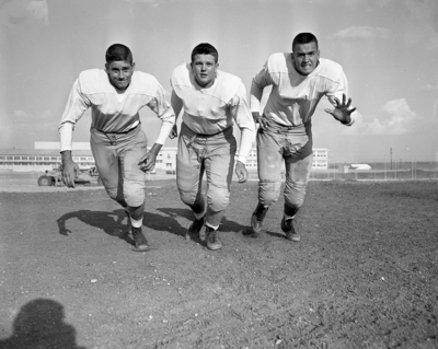 Three Brewer High School football players are shown running next to each other during practice. They are Hay Shaw, John Waggoman, and William Roach.