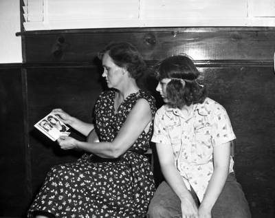 Back at Salvation Army - Kim, self-styled Iroquois Indian, was returned to the Salvation Army Tuesday by Mrs. E. E. Bowen. Mrs. Bowen and her husband took Kim to their Jack County ranch last weekend to help with the horses but Kim was unequal to the task. Mrs. Bowen and Kim are shown here in the office of Major W. T. Johnson of the Salvation Army as they examined pictures of Connie Smith and Kim.