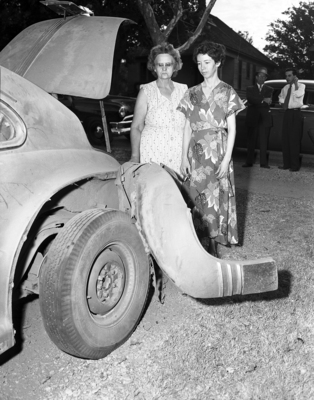 Inspects Damage - Mrs. L. F. Williamson, left, looks over damage to her husband's car from a bomb which exploded early Tuesday. With her is Mrs. Ervin Longino, who occupies an apartment at the address.