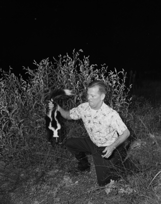 J. E. Key, Skunk-hunter, seen holding a skunk by the hind.