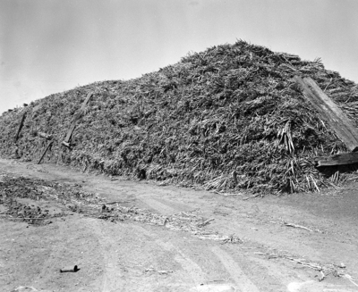 Sorghum hay is stacked high and long on the Gracey ranch at Roscoe. This is one of six stacks on the place this spring. Published in Fort Worth Star-Telegram morning edition May 7, 1950.