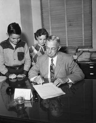Proclaiming Their Day - William Wright and Merle Menge, both of Lena Pope Home, watched Wednesday morning while Mayor Edwards signed a proclamation naming September 27 "National Kids' Day in the City of Fort Worth" as part of a national Kiwanis Club project. The city's four clubs and Carswell Air Force Base will participate in the program.