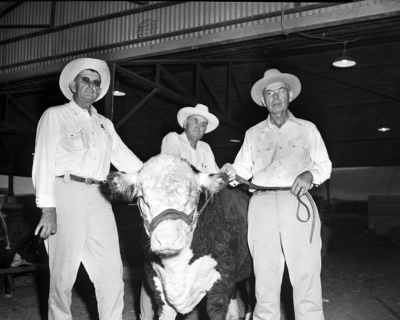 Denton Fair Opens - Fine livestock held the foreground Wednesday at the opening of the Denton County Fair. M.G. Brown, left, Denton Hereford breeder, with a young bull which he will show Friday. Center, Dr. Jack Skiles, fair manager, and Earl Foreman, fair buildings and grounds superintendent.
