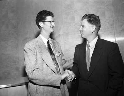Congratulations! - Mike Carpenter, right, news editor of Radio Station KTRN at Wichita Falls, is being congratulated by Bob Bradbury of Lamesa, manager of KPET, on his Wednesday morning election as president of Texas AP Broadcasters Association.