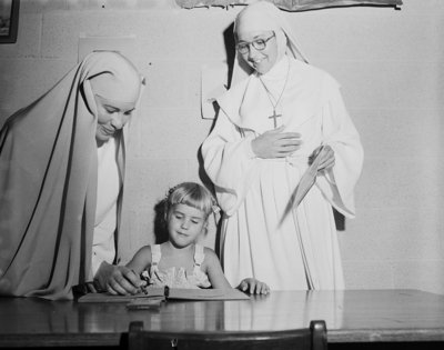 Sister Muriel, left, and Sister Constance, right, teachers in the parochial school at All Saints Episcopla Church, are assisting 6-year-old Victoria Liggitt with her first grade work. She is the daughter of Mr. and Mrs. Fred R. Liggitt.