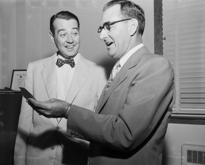 W. K. Stripling Jr., left, and Ira Kersnick, chairman of the retail ticket sales committee, check tickets for the giant sales rally at Will Rogers Memorial Auditorium Sept 22. Tickets were available in the Chamber of Commerce, Fortune-2491.