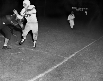 Larry Garrison, North Side back, gains nine yards against Snyder at Farrington Field. Moving in to make the tackle is Buster Moss, Snyder guard. The Steers won, 39-0. Published in Fort Worth Star-Telegram morning edition September 19, 1952