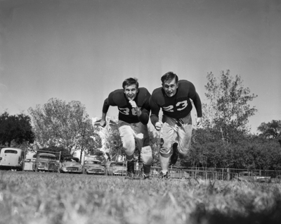 Dale Stephenson, a 200-pounder, left, and Walter Gill, 203, will be at tackle slots for Paschal against Amon Carter Riverside. Both are lettermen. Published in Fort Worth Star-Telegram evening edition October 21, 1952.