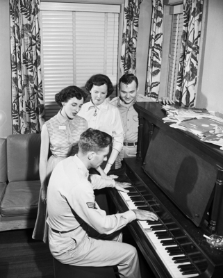 These are typical scenes of some of the nightly activities in Fort Worth's Armed Forces Center at 514 W. 5th. Left to right are , Misses Jeanean Swindall, Shirley Hale, and A/1C Gerald Clandy are enjoying the music of A/1C Robert C. Straight.