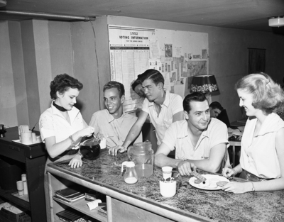 The ever-present free coffee is being poured at the snack bar by Miss Sue Edwards, while A/2C Merl Wagoman, A/3C Kenneth D. Brayton, A/2C Rudy Garcia-Gomez Jr., and Miss Virginia Martz, left to right, line the rail.