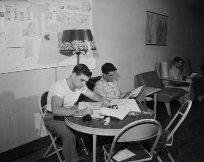 A/3C Jacques Weisel works on a correspondence course while A/3C Bernard I. Partegas relaxes with a magazine in the reading room.
