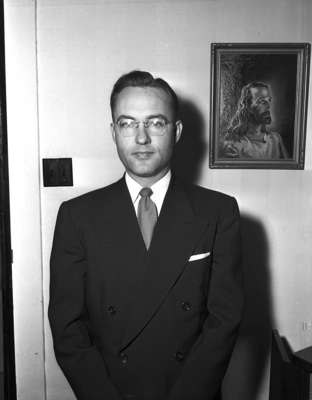A portrait of Reverend E. W. Gathings, Cleburne Methodist pastor. Mr. Gathings is standing next to a painting of Jesus.