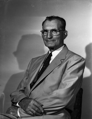 A portrait of Dr. George Flaherty, retiring veterinarian. Mr. Flaherty is seated in a chair.