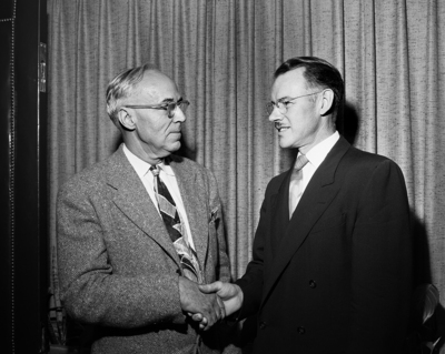 Dr. Paul L. Myers of Wichita Falls, left, and Dr. A. E. Gambriel of Fort Worth are shown shaking hands.