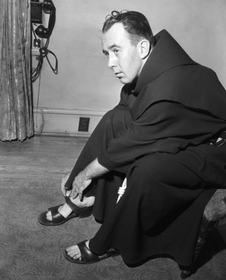 Image shows Reverend Sebastian Egan putting his shoes on. Published in Fort Worth Star-Telegram morning edition April 6, 1950.