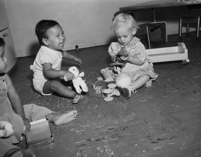 In this one, Johnny, 2, acts as though he isn't happy about the situation while playmate Karen, 21 months, can't be bothered.