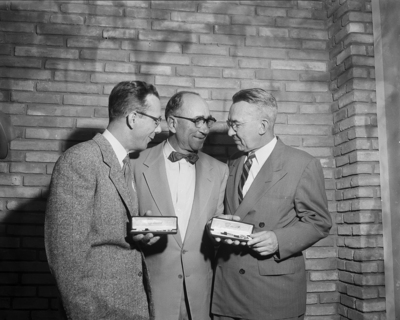 W. W. McClister of Krum, center, acted as mater of ceremonies here when two Texas Chrysler dealers were honored. Gold watches were presented to Emory Reece of Sherman, left, secretary of the Fort Worth district, and to H. B. Ransom, right, of Fort Worth, who organized the group. Thirty Chrysler dealers attended the informal get-together at Western Hills Hotels.