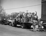 Arlington High School students scramble aboard one of the trucks they manned in picking up rubbish left for them on sidewalks by householders as part of the annual clean-up drive. Published in Fort Worth Star-Telegram morning edition April 6, 1950.