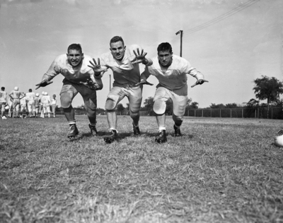 When North Side goes against Poly at Farrington Field, these three starting linemen will be out to put a crimp in the Parrots' rushing plans. Left to right are Buddy Oujesky, Calvin Harmon and Don Cowart. Published in Fort Worth Star-Telegram morning edition October 22, 1952.