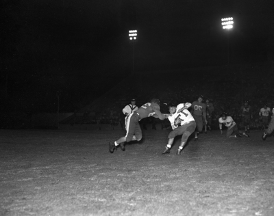 Arlington Heights' Vance Bridges comes to sudden stop as Sunset's Harry Mitchell applies brakes at Farrington Field. Bridges starred in Jackets' 19-13 victory. Published in Fort Worth Star-Telegram evening edition September 26, 1952.