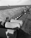The irrigation of ranch and farm plains in Lubbock County. The skilled workmen join and seal pipe to prepare the irrigation lines for covering with dirt by a bulldozer on the Brashear farm.