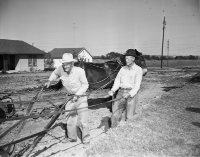 The city will retire four street grading team gangs after 25 years. They will be replaced by modern mechanized equipment. Two of the veteran team gang men, Hershell Young, left, and Claude Commander are shown finishing up their last job Friday afternoon on Donna Street.