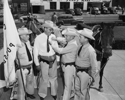 Sheriff Harlon Wright, center, dons sombrero and chaps as an honorary member of Cowtown Posse, flanked by Ed Ruckman, left, drill captain, and T. C. Risinger, right, president, with unidentified man to far right.