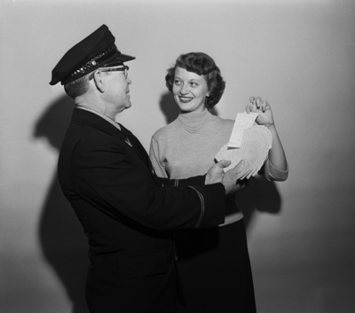 Miss Elaine Baggett, service representative of Southwestern Bell Telephone Company, is shown buying from Captain Carl A. Senior the first ticket to this year's Firemen's Ball, held on October 10th at Lake Worth Casino. The proceeds went to the firefighters' pension fund. Ken McGarrity's orchestra played.