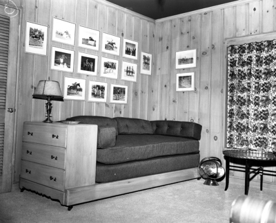 Pine paneled den. There is a large couch with dresser attached to one end with three drawers. There are many pictures of people riding horses on the wall.