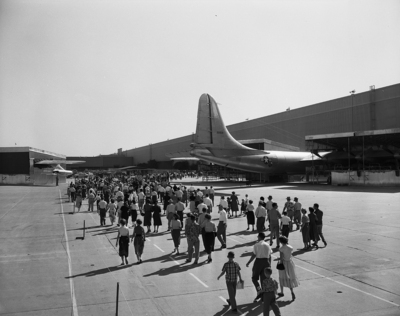 Part of the 55,000 visitors at Convair's open house. People stream back after getting a closer look at B-36s in the making along the one-mile assembly line.