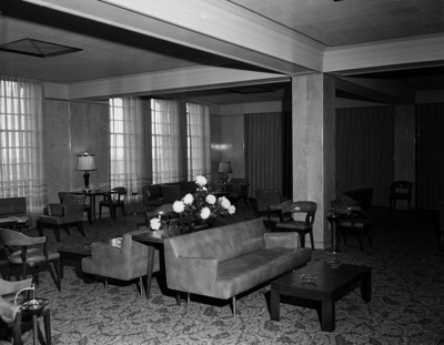 Hotel Texas. View of the southwest portion of the Silver Lounge. Furniture is cinnamon colored leather, drapes are dove gray, with metallic trim, and wall panelling is curly maple.