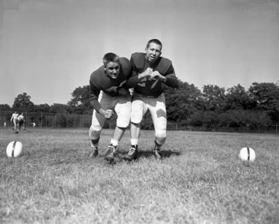 Starting tackles for Amon Carter Riverside will be Addison Maclin, left, and David Chapman, in the game against Arlington Heights. Published in Fort Worth Star-Telegram morning edition November 5, 1952.