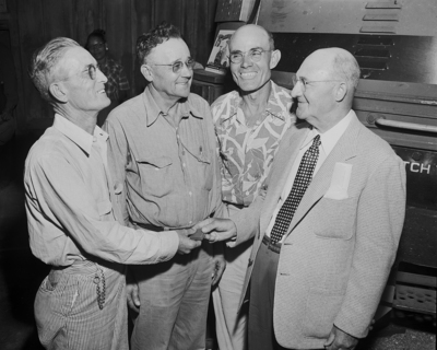 Four men standing from left to right are, T. M. Leek, J. E. Sawyer, H. M. Damiel, and J. A. Hodges.