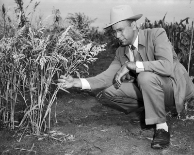 Series on the Lubbock experiment station. An unidentified man is crouching on the ground and looking at field crops.