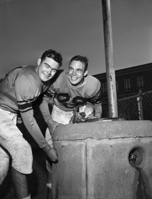 Charles Smith, left, and brother, Raymond, will be in Poly lineup when the Parrots invade Wichita Falls to play the Coyotes. Charles is a halfback and Raymond's a guard. Published in Fort Worth Star-Telegram morning edition October 15, 1952.