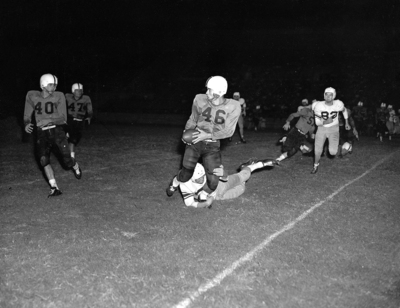 Lubbock's Jimmy Welch prepares to lateral after being hit by a North Side tackler at Farrington Field. Lateral worked as Westerners picked up 11 yards on the play. Published in Fort Worth Star-Telegram edition October 5, 1952.