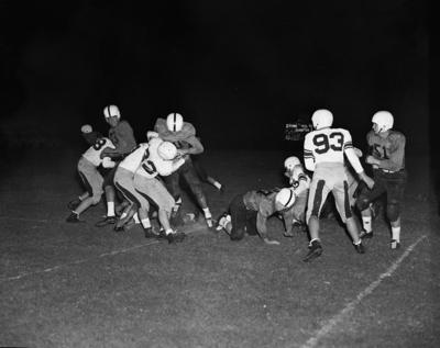 Jimmy Haynie, Lubbock quarterback, fights the last yard for the Westerners' first touchdown against North Side at Farrington Field. Trying to stop him is Jimmy Shofner (82). At left is Lubbock's Ben McCollum (73). Published in Fort Worth Star-Telegram morning edition October 4, 1952.
