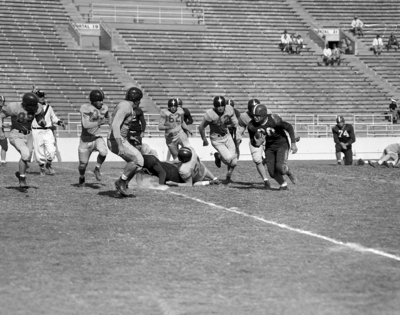 Fullback Don Caylor (30) from Plainview moves out after taking a lateral from Bob Wilson (on ground) of Fort Worth in the Texas Christian University- Rice freshman game. Owls in pursuit include Guard Bill Purvis (62) of La Vega and Halfback Page Rogers (42) of Houston. Published in Fort Worth Star-Telegram morning edition October 4, 1952.