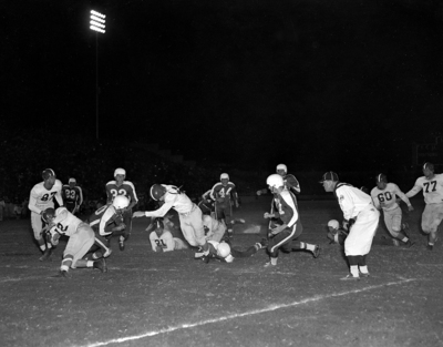Ray McKown, Texas Christian University tailback, crashes over the Arkansas goal line for the second Frog touchdown in game at Amon Carter Stadium. The play started on the Arkansas 7. Frog players are Jack Ray (12), and Bob Blair (87) and John Harville (21). Texas Christian University won the Southwest Conference opener, 13-7. Published in Fort Worth Star-Telegram morning edition October 6, 1952.