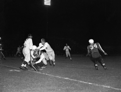 Arkansas' Buddy Sutton is brought down by Texas Christian University's Ronald Fraley and Wayne Martin (84) after a 15-yard gain from the Porker four-yard line. It happened on the last series of Arkansas plays in the first quarter. Texas Christian University won its conference opener, 13-7. Published in Fort Worth Star-Telegram evening edition October 6, 1952.