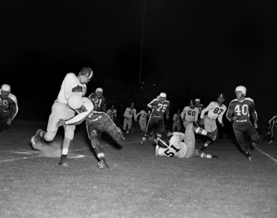 Ray McKown, the "big horse" of Texas Christian's attack against Arkansas, keeps a wary eye on the sideline as he picks up six yards against the Razorbacks in the first quarter. Pushing him out of bounds is Dean Pryor, Arkansas defensive back. The Frogs won the title opener, 13-7. Published in Fort Worth Star-Telegram morning edition October 5, 1952.