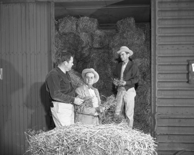 Herman Cole, T. J. Elkins and M. M. Wright looking at hay shipped from Wisconsin