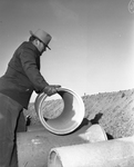 A man is seen working with a piece of irrigation pipe on a ranch or farm in Lubbock County.