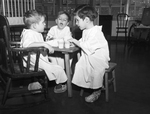 The image shows three young boys, all hospital patients with serious illnesses and maladies. The boys, left to right, Charles Cook, Charles Hubbard, and Cecil Ross, are shown as they re-live the adventures of "Little Red Riding Hood", unaware of the photographer.