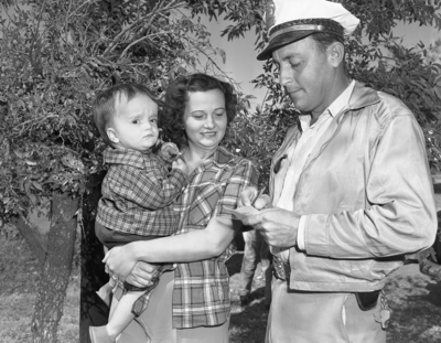Mrs. H. F. Bethurum holding her 1 year son, Jimmy, and C. A. Hunter who is writing on a piece of paper.