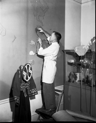 Duard Marshall, head of arts and crafts, was nailing a geographical feature of South America to a map exhibit.